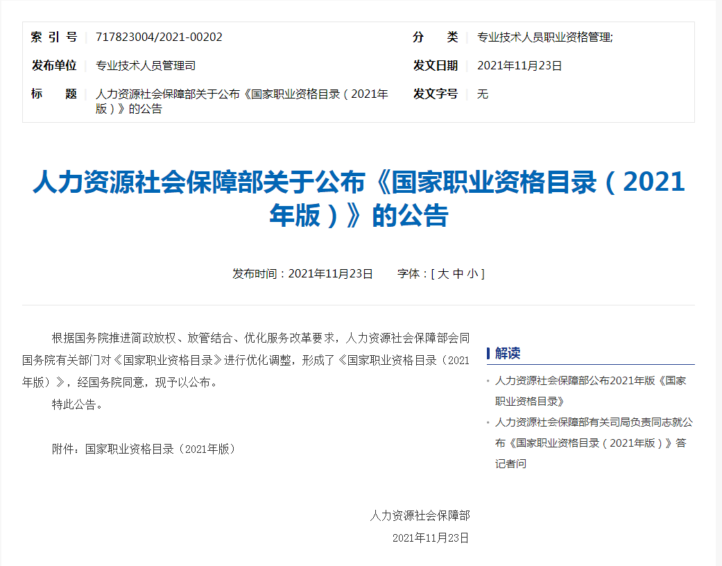 人力資源社會保障部關于公布《國家職業(yè)資格目錄(2021年版)》的公告